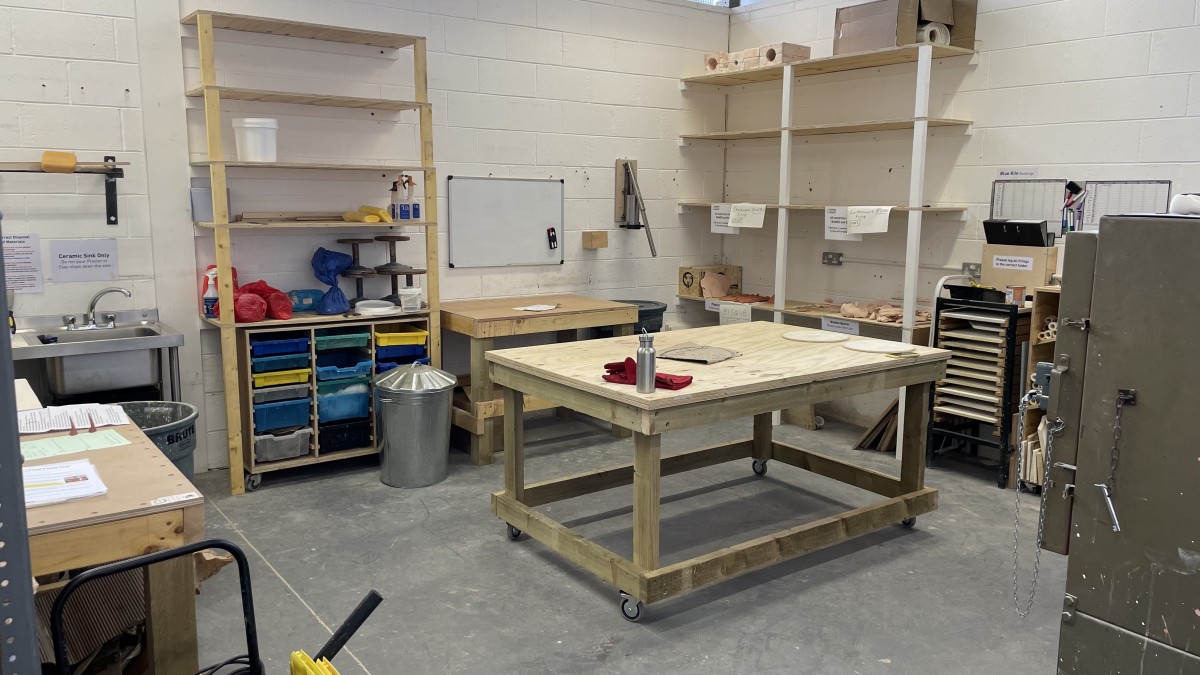 Our Ceramics Workshop has a large central worktable and two side benches, suitable for working on hand building and sculpting with clay, and a small drying space.